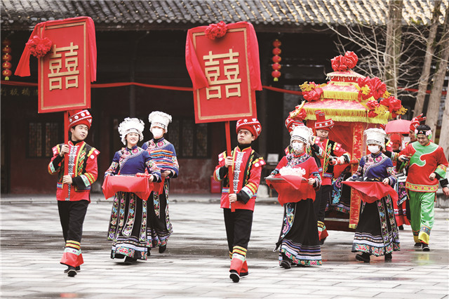 1月2日,在蚩尤九黎城景區,身著節日盛裝的苗家阿哥、阿妹在九道門迎接游客,與游客互動對山歌,引導游客跳竹竿舞、體驗苗家婚俗,讓游客在豐富多彩的文化活動中度過愉快的假期。