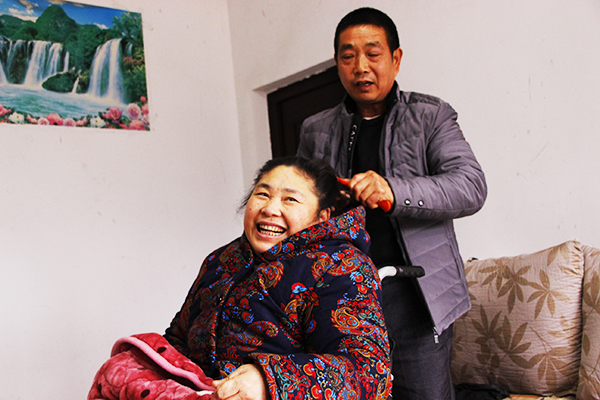 11月23日,小雪過后的鹿鳴鄉雙楓村日漸寒冷,但阮仕合的家里卻暖意融融。房間里,阮仕合輕聲地給妻子張家術說:“老張,我們梳頭了,輕輕梳哈。”阮仕合一邊說著,一邊熟練地梳起妻子長長的秀發。話音剛落,坐在輪椅上的妻子張家術,發出如孩童般的笑聲應和著丈夫阮仕合。