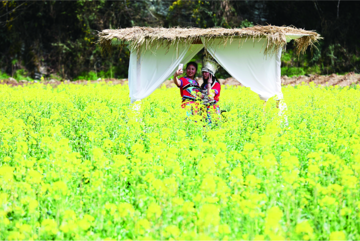 3月9日,游客在太原鎮區陽村觀賞油菜花,享受春光。