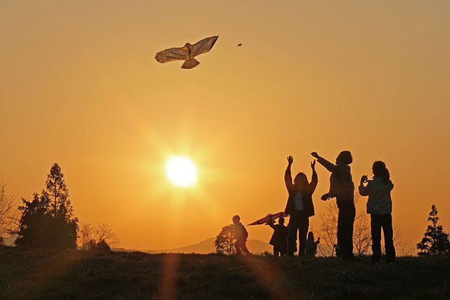 3月11日,在漢葭街道北斗村的一片草坪上,孩子們在夕陽的余暉下放風箏。