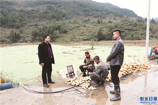 邵紅二(左一)在蓮花寺村蓮藕種植基地了解收成情況。