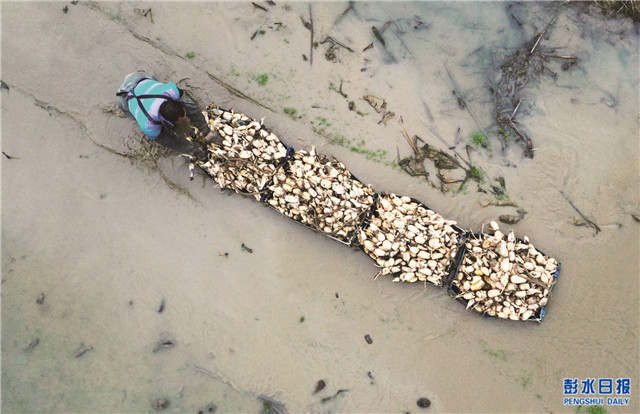 中國彭水網(wǎng)(融媒體記者 廖 唯 攝影)3月1日,潤溪鄉(xiāng)蓮花寺村藕田,挖藕工人正在采收蓮藕。蓮花寺村通過流轉(zhuǎn)撂荒田地,因地制宜種植蓮藕,壯大村級產(chǎn)業(yè),助農(nóng)增收。