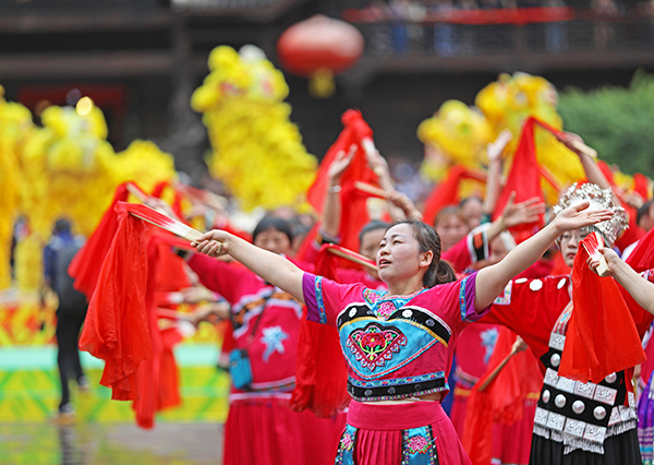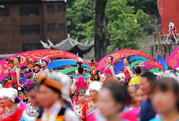 古色古香的蚩尤九黎城苗戲樓前,苗歌此起彼伏、抑揚(yáng)頓挫,有張有弛,充分展示了苗鄉(xiāng)兒女們對(duì)生活的熱愛(ài)和勤勞質(zhì)樸、奮發(fā)向上的人生態(tài)度,也體現(xiàn)了彭水人民對(duì)美好新時(shí)代的感恩,對(duì)美好生活的新希望。