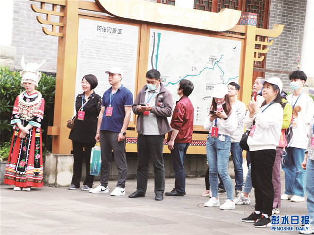 5月20日,在景區旅游推介會上,閬中市、西昌市、彭山區、彭水縣先后作文化旅游資源及線路推介。苗家嬌阿依一一推介了蚩尤九黎城、摩圍山、阿依河景點的線路和彭水特色美食,讓踩線團更加了解彭水的旅游資源。