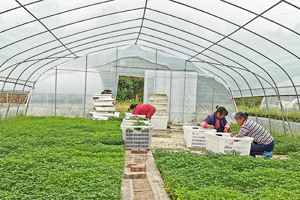 村民在大棚轉(zhuǎn)移辣椒苗。