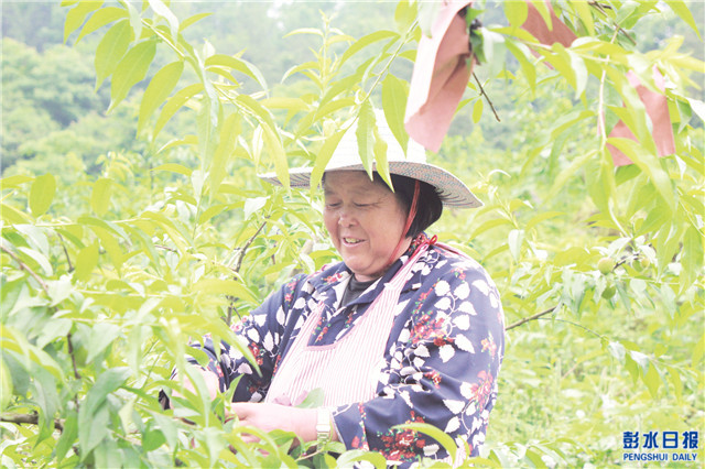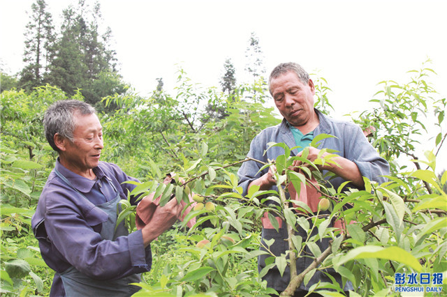 重慶彭水網(融媒體記者 陳興盛 黃智宇 張茂玉 文/圖) 日前,在長生鎮三合社區黃桃觀光園里,一個個果子已掛滿枝頭,桃林間,20多名村民正忙碌著,為黃桃疏果套袋。