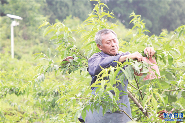 記者在現場看到,村民們站在樹下,手持工具疏剪掉長勢畸形、有病蟲以及萎蔫的果實,保留個頭大、狀態好的果實并套上袋,一個個紅色的袋子點綴在綠葉間,為桃林增添了一抺亮色。