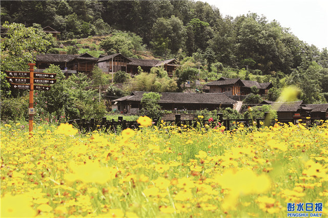 6月8日,初夏時節,鞍子鎮羅家坨苗寨的黃金菊盛開,與古色古香苗寨建筑相映成趣,好似一幅美麗田園畫。