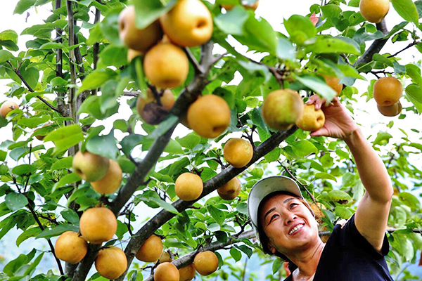 喬梓鄉發展經果林產業,游客前來采摘梨子。
