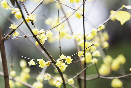 在山谷公園里,一株株臘梅已迎風盛開,幾近透明的黃色杯狀花瓣密密麻麻地生長在沒有葉子的枝椏上,星星點點,蠟一般晶瑩剔透,俏皮而可愛。