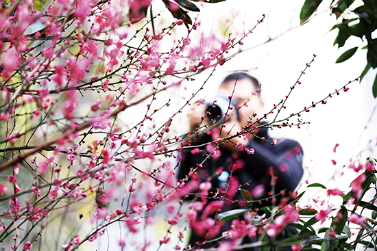 來到沙沱社區三橋附近,便會覺得暗香撲鼻,沿著公路便可以看到道路兩旁錯落有致的紅梅花,清雅的花香隨著寒風陣陣浮動,湊上前細看,粉紅的花朵仿佛金雕玉鏤一般,有些還裹著絲絲紫紅色的花蕊,顯得分外澄澈晶瑩。