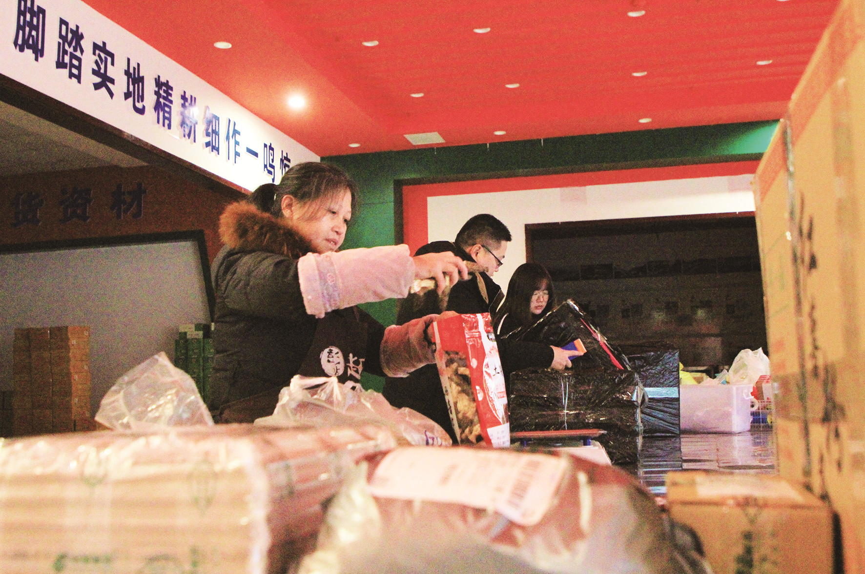 網(wǎng)貨加工中心的工作人員正在對(duì)顧客下單的農(nóng)特產(chǎn)品進(jìn)行訂單處理、打包、發(fā)貨。