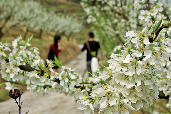 在巖東鄉青脆李基地,成片潔白的李花盛放如雪海卻又有著格外的靈動、美妙之處,無論是枝頭的含苞欲放,還是迎風的熱情綻放,都是妙不可言的風景。這些花兒悄然傲立于枝頭,小鳥、蝴蝶在花間飛舞,人在樹下,如入花海,成為游客拍照打卡勝地。