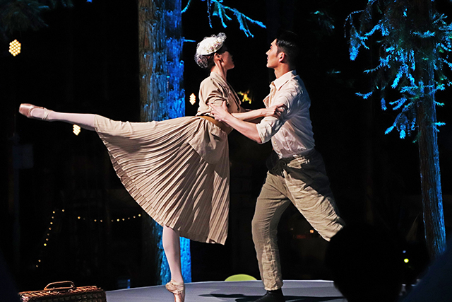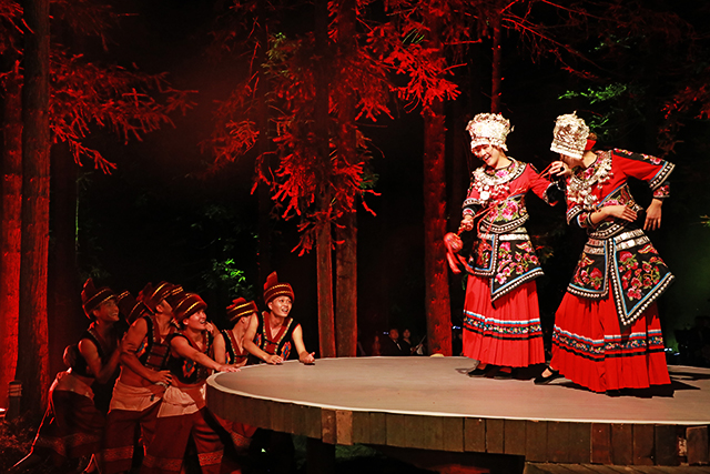 圓形舞臺掩映在郁郁蔥蔥的林間,在紅色、紫色、藍色等燈光的映襯下變得如夢如幻,觀眾散布在林中觀看演出。