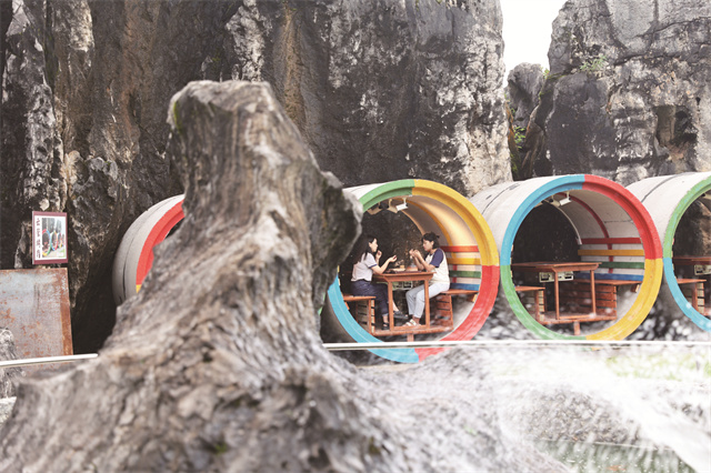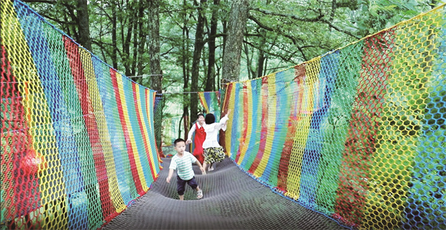 園內除了有趣又安全的兒童設施外,游客還可以穿越原生態的石林迷宮,來一場石林探險,打卡天空之境。也可以和朋友們在彩虹“云管”圍爐煮茶,聊聊天,靜享清涼。