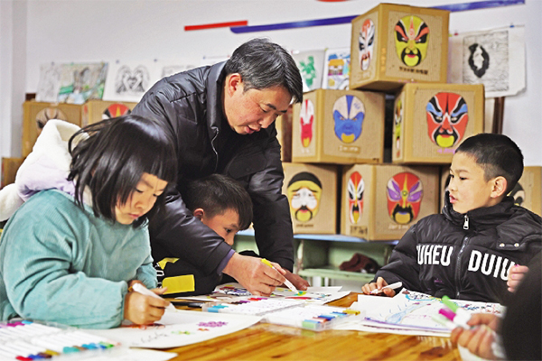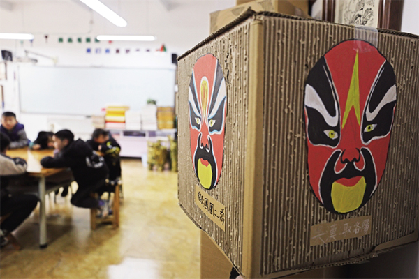 在30多平方米的美術室里,四周墻壁上都掛滿了孩子們的作品,在廢棄紙箱上繪制的臉譜千姿百態,用樹葉制成的工藝品裝飾畫栩栩如生,用紙箱子、超輕粘土和丙烯顏料做成的仿青銅器古色古香……