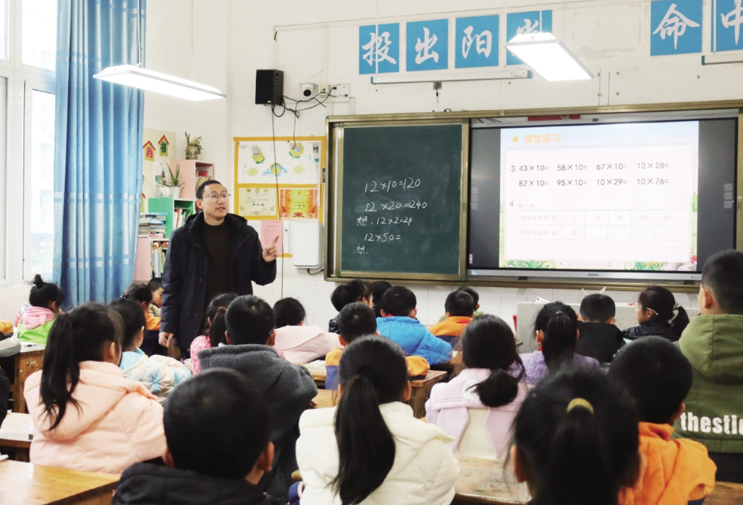 在彭水第五小學(xué)三年級教室,只見楊成義耐心講解黑板上的例題,幾十個孩子坐在教室里,聚精會神地聽講,像幾十株花兒靜靜地感受著辛勤園丁的澆灌。