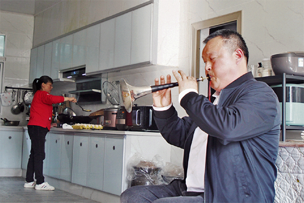 回到家,任建榮繼續(xù)忙碌了起來(lái),清洗完裝豆腐的工具后,就忙著在廚房做飯。如果沒(méi)有其他的事情,王洪則在一旁擺弄起自己的業(yè)余愛(ài)好——嗩吶,默默地陪伴著。任建榮也學(xué)會(huì)了打鼓,空閑時(shí),一個(gè)打鼓、一個(gè)吹嗩吶,兩人卻能恰到好處地配合起來(lái)完成一首曲子。