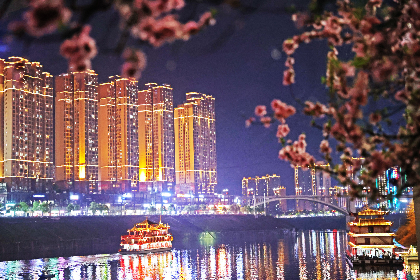在烏江重慶彭水縣城段,一艘游船航行江面上,與夜景中的城市交相輝映,景美如畫。