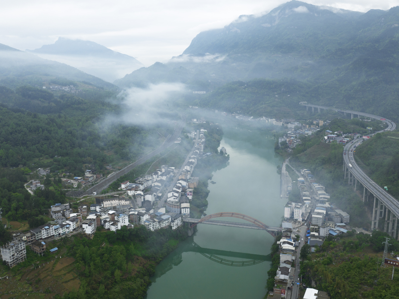 晨霧籠罩下的高谷鎮,青山、碧水、橋梁、建筑等共同構成一幅幅美麗的鄉村畫卷。