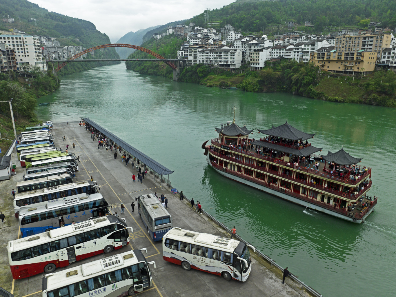 在高谷鎮水域,游客們登上游船,暢游烏江畫廊。