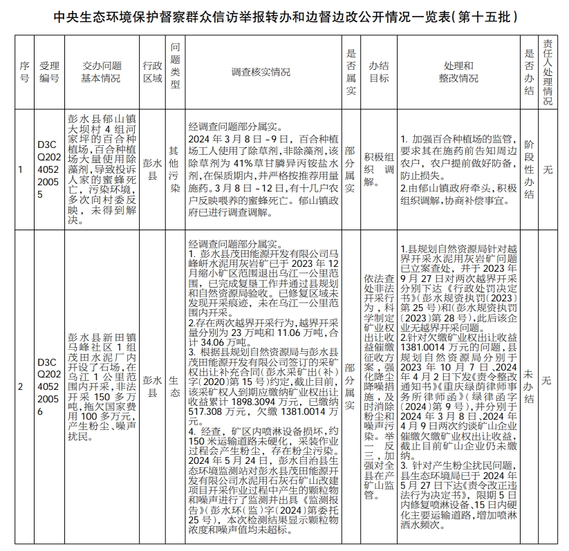截至2024年6月2日,對中央第六生態環境保護督察組向重慶市移交的第十五批群眾信訪舉報件,涉及彭水自治縣2件(已辦結1件,正在辦理1件),已按要求調查處理,現向社會公開。
