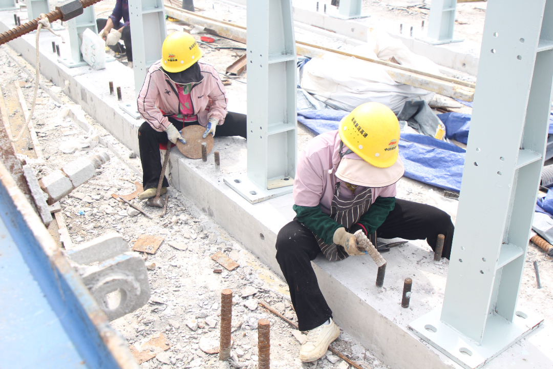 記者在施工現場走了一圈,看到每位工人都做充足了安全保護,因為每天行走在滾燙的鋼筋水泥間,無論男女,他們的臉頰早已被曬得黝黑發亮,汗水浸透了他們的工作服,透出深淺不一的色塊。